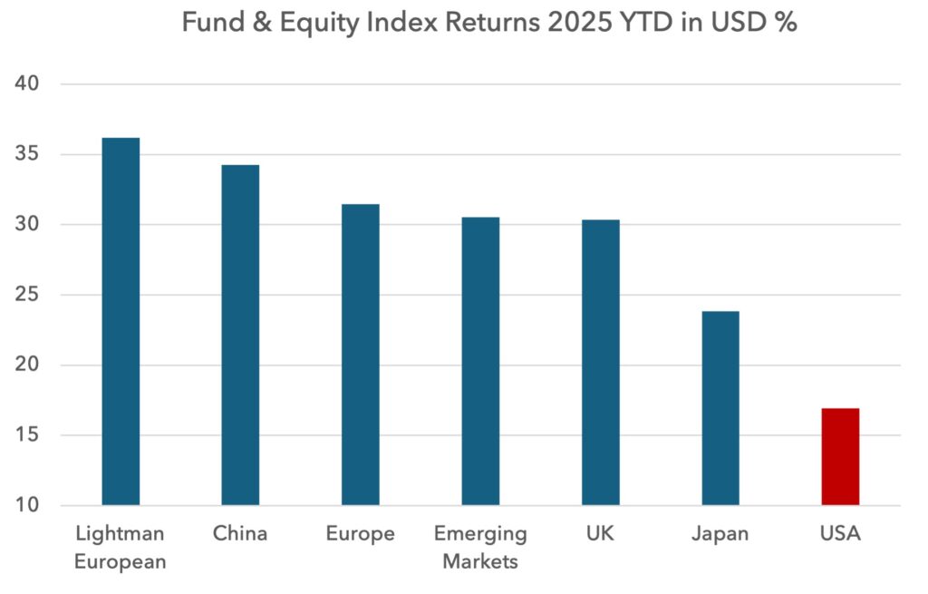 European equities are experiencing their seventh best year versus US equities since 1969. Despite the AI euphoria, US underperformance has been significant in 2025.