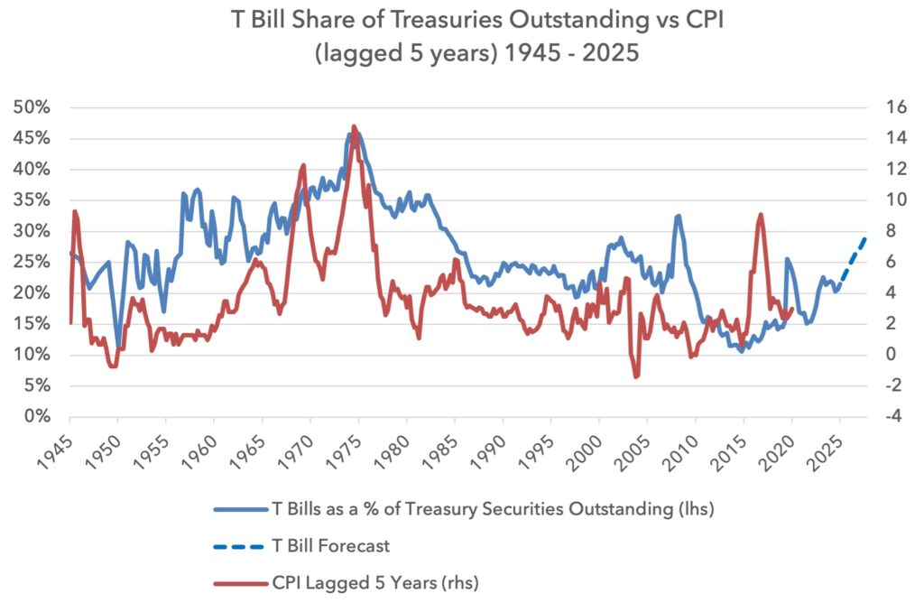 Today T-Bills make up 21.5% of Treasuries outstanding and there is speculation that this could rise toward 27-30% in the coming years.