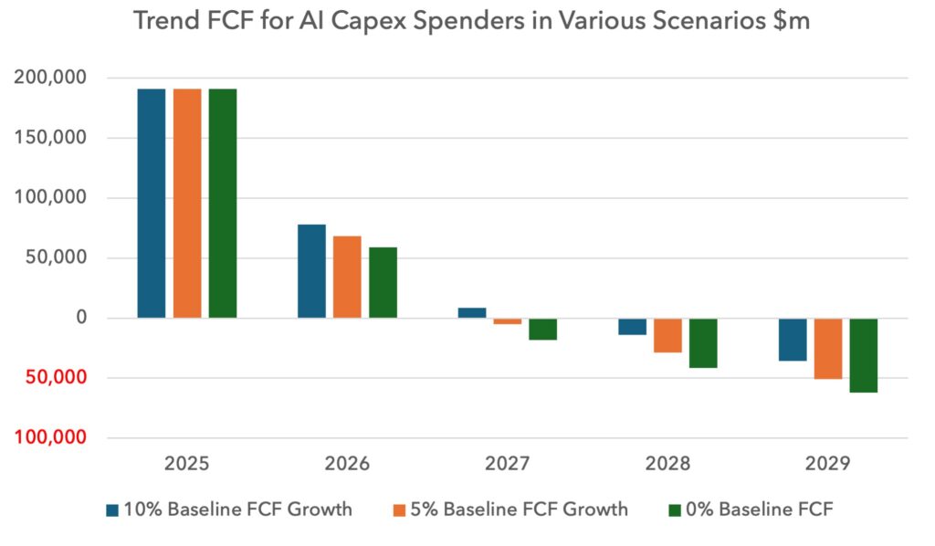 In almost all scenarios, free cash flow goes negative in 2027. This might explain the flood of debt issuance by the AI spenders recently.