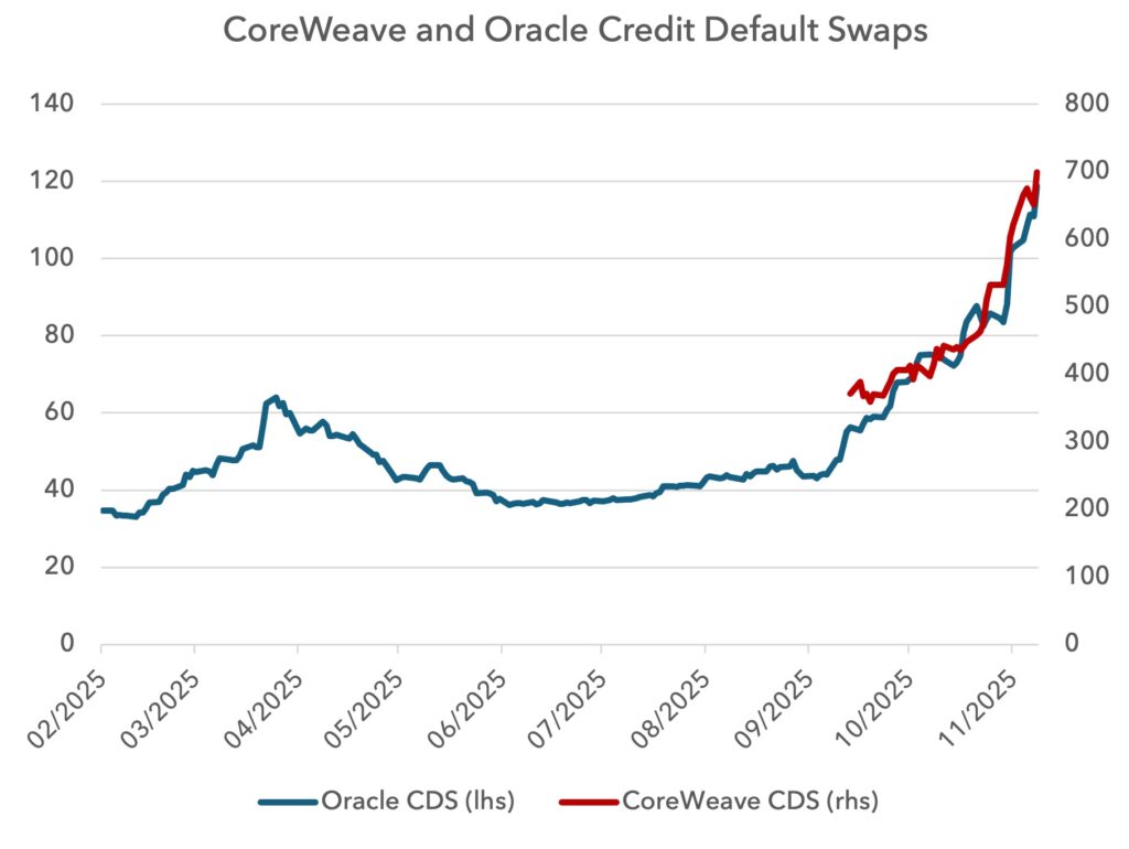 Certain companies are already showing signs of strain. CoreWeave’s credit default swap is now at 705 basis points and Oracle’s is at 120, with both having surged in recent weeks. At 705 basis points, the implied probability of a CoreWeave default over five years is 46%.