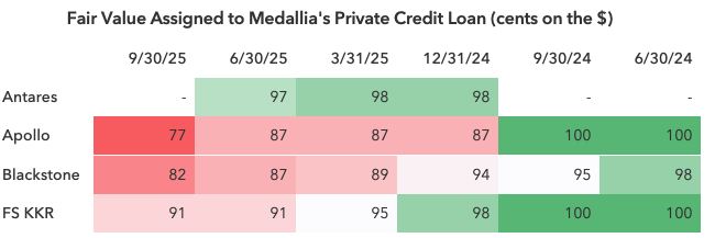 Bloomberg recently ran a report on the widely varied pricing of a private credit loan to Medallia, a Thoma Bravo-backed software company. We show how the pricing of this security varies by investor over time below: