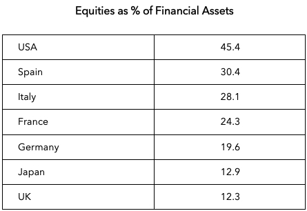 In Europe the OECD compiles similar data to the Fed, with a lag. There may be some small definitional differences with the Fed but they are very similar. Here we do not show the data ranked in percentile terms, but instead the absolute percentage allocations to equities as a proportion of financial assets. This allows us to compare countries to each other.